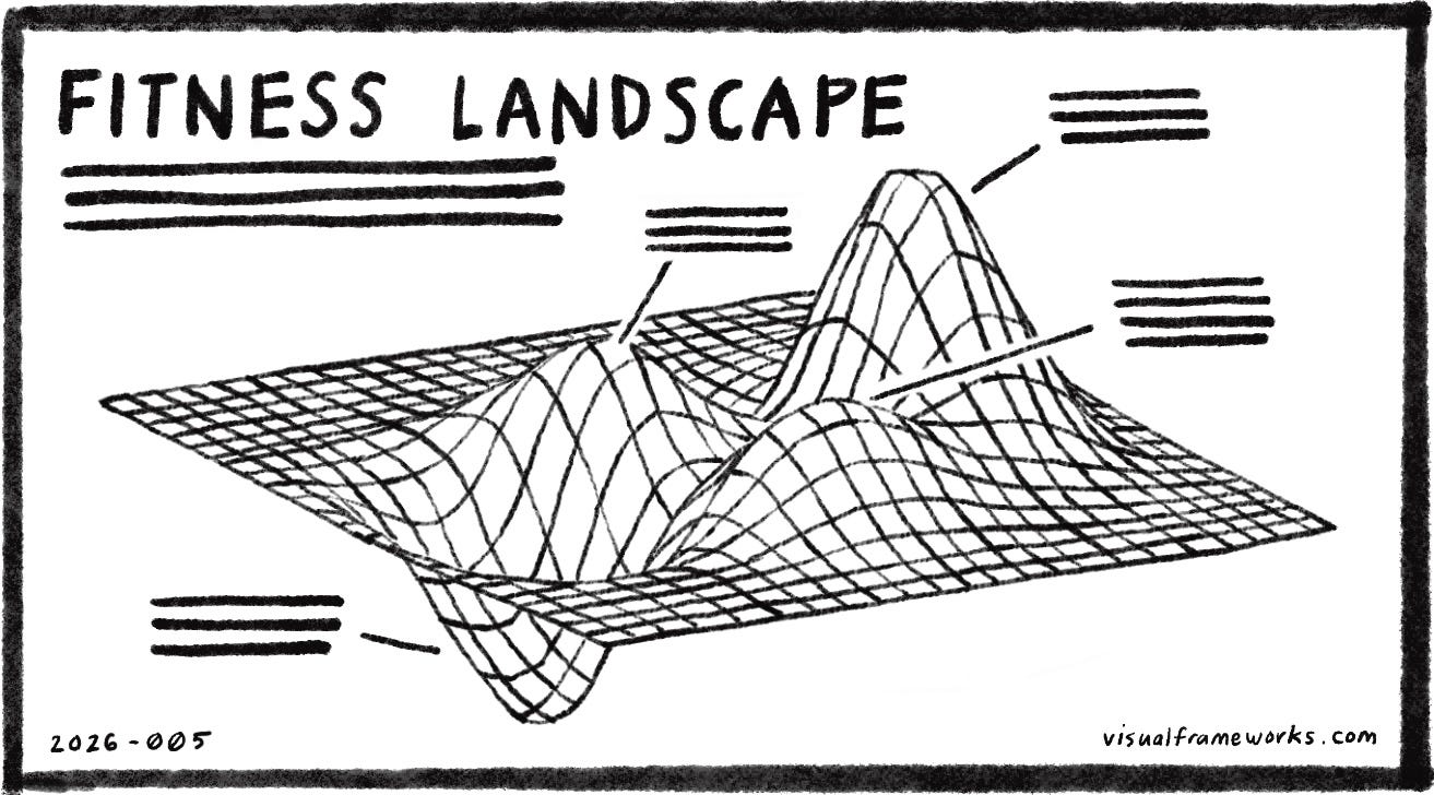 In evolutionary biology, a fitness landscape maps the relationship between genetic variation and survival. Imagine a three-dimensional terrain: peaks represent combinations of traits that help an organism thrive; valleys represent combinations that don’t. Evolution climbs this surface through incremental selection, moving uphill one small step at a time.