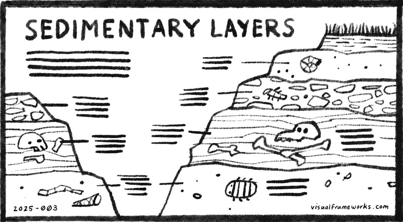Complex problems, organizations, and systems often develop in layers over time. Like geological strata, each layer represents decisions, technologies, or structures from a particular era that remain embedded in the present. Understanding these layers helps you see why things are the way they are and identify which layers might need excavation or preservation.